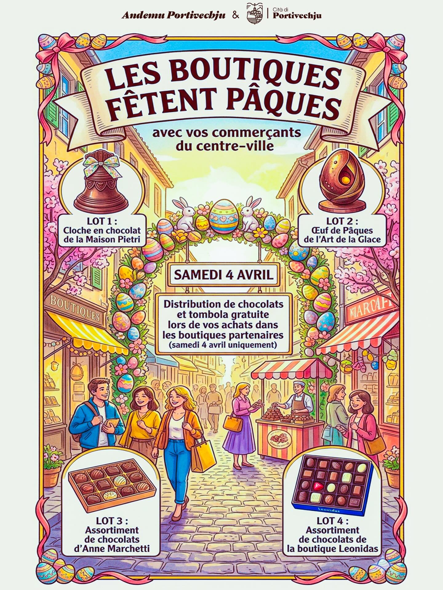 À l’occasion de Pâques, les boutiques partenaires du centre-ville de Porto-Vecchio vous invitent à une journée festive et gourmande ! Samedi 4 avril, profitez d’une ambiance conviviale en flânant dans les rues commerçantes et laissez-vous surprendre par une distribution de chocolats offerte tout au long de la journée.